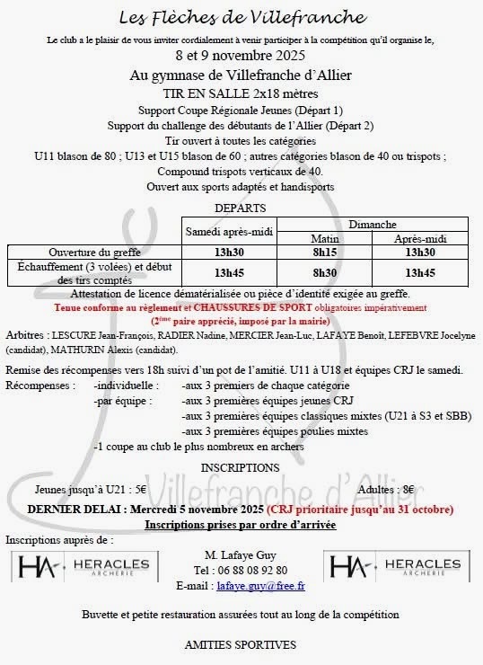 Le club des Flèches de Villefranche vous invite à sa compétition en salle les 8 et 9 novembre 2025.