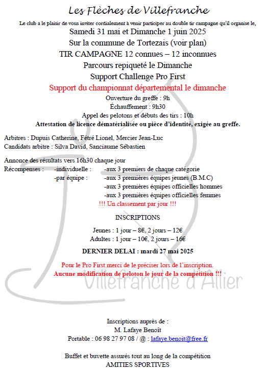 Les Flèches de Villefranche vous invitent à leur tir campagne le samedi 30 mai et le dimanche 1er juin sur la commune de Tortezais.